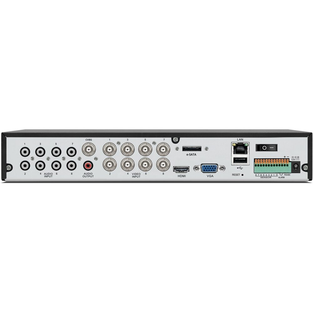 - 8 видеовходов BNC, видеовыходы HDMI, VGA и BNC, 8 входов аудио и 1 выход, 8 тревожных входов и 1 выход, e-SATA, RS485, 2 порта USB