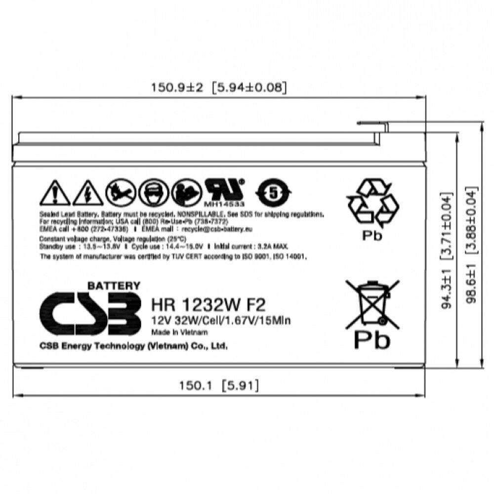 Теги: CSB HR1232W F2, Исполнение:AGM, Особенности:Установка внутри помещения, Номинальное напряжение, В:12, Емкость батареи, Ач:2.7, Количество циклов полной зарядки:260