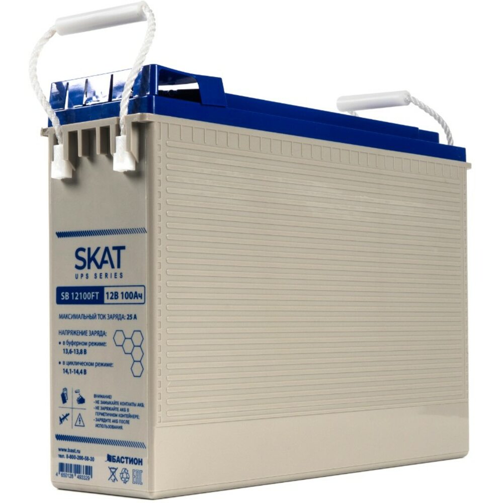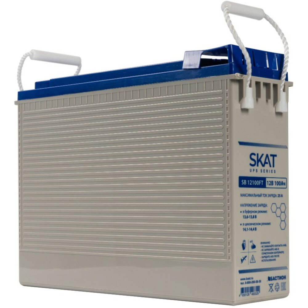 Аккумулятор герметичный свинцово-кислотный необслуживаемый SKAT SB 12100FT, производимый по технологии AGM (Absorbent Glass Mat) с системой рекомбинации газов VLRA, предназначен для использования в составе системы резервного питания.