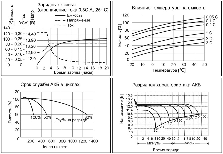 - через 1 час (ток разряда – 1С): 7.2 - % ёмкости через 20 часов в зависимости от температуры эксплуатации:
