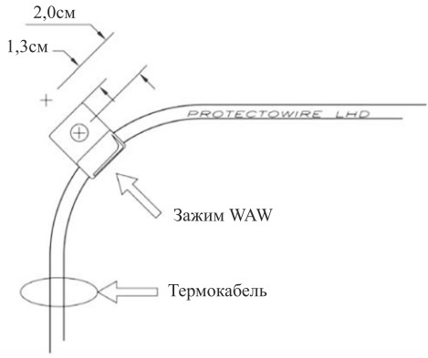 Для монтажа термокабеля в углах и на поворотах помимо прочного крепления необходимо обеспечить его свободное изгибание. Для этого зажимы размещаются на расстоянии 1,3-2 см от пересечения линий и полностью затягивают лишь после того, как кабель будет закреплен между углами.