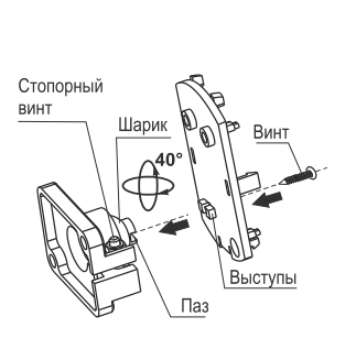 - обеспечивает поворот извещателя в горизонтальной и вертикальной плоскостях на 40º.