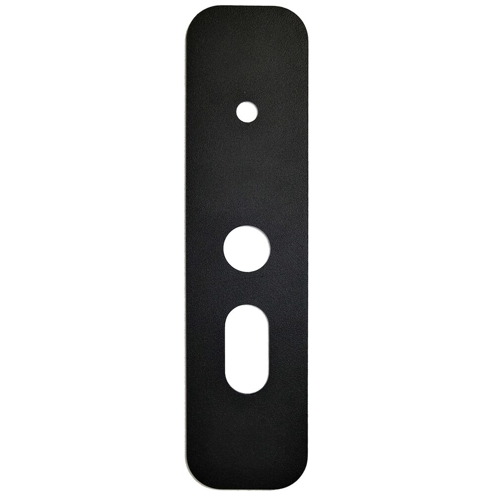 Конструкция включает в себя металлическую пластину из крашеной стали с габаритными размерами 312x77 мм и толщиной 2 мм. Черное покрытие металла способствует долговечности и эстетичному виду, обеспечивая устойчивость к износу и повреждениям.
