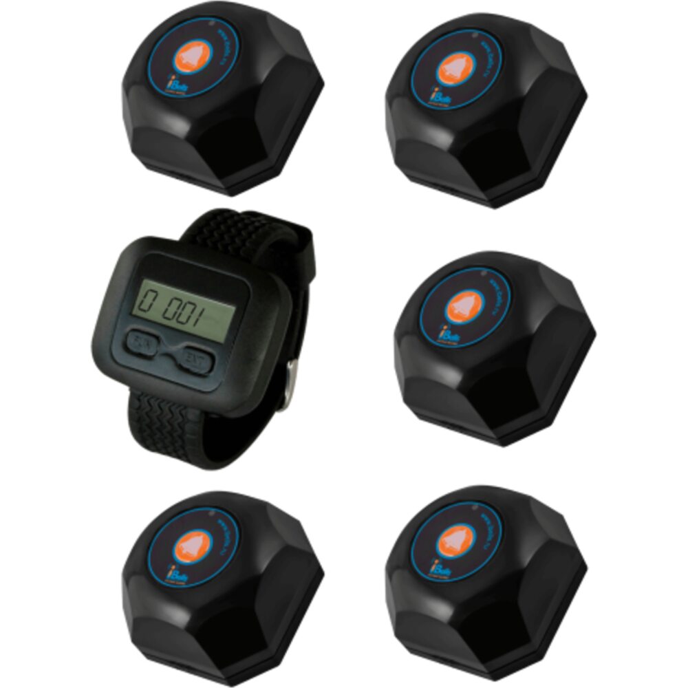 Комплект системы вызова персонала включает в себя: наручный пейджер iBells 203 и 5 кнопок вызова iBells 301 (чёрная). Комплект подойдет для любого заведения, где может потребоваться вызов персонала посетителями: в кафе, ресторане, отеле, фитнес центре, в супермаркете или магазине одежды, в медицинском учреждении и тд. Также система подходит для организации связи между персоналом.