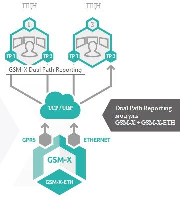 Простое расширение за счет Ethernet-модуля GSM-X-ETH, позволяет добавить очередной канал связи и осуществлять отправку информации по двум независимым друг от друга каналам (Ethernet и GPRS). Устройство постоянно контролирует связь с ПЦН, и, если возникнет необходимость, заменит один канал другим. В европейских отраслевых стандартах данное решение определяется термином «Dual Path Reporting». Оно соответствует наиболее строгим нормам категории DP4 стандарта EN 50136, определяющего требования к надежности и к механизмам обеспечения связи, а также доставки информации.
