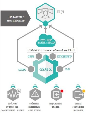 Модуль можно интегрировать как в эксплуатирующиеся системы, так и применять его на новых объектах. GSM-X может получать информацию о событиях от подключенного к нему приемно-контрольного прибора. Полученную информацию он отправляет на ПЦН или непосредственно заинтересованным лицам, используя сеть Ethernet* или GSM. Прибор к модулю подключается через телефонный модуль автодозвона прибора (GSM-X имитирует ПЦН) или с помощью входов и выходов устройств.