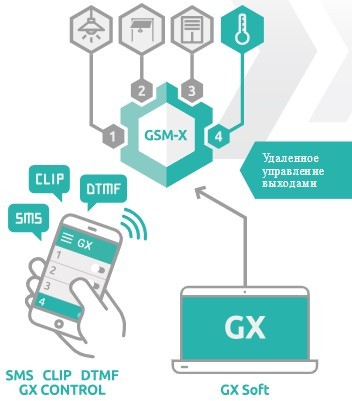 GSM-X имеет 4 выхода, которыми можно управлять удаленно и активировать их практически из любой точки мира, используя следующие инструменты: SMS, CLIP, DTMF-сигналы, мобильное приложение GX CONTROL или ПО GX Soft. Благодаря этому с помощью модуля GSM-X можно управлять не только охранной сигнализацией, но и элементами автоматики.