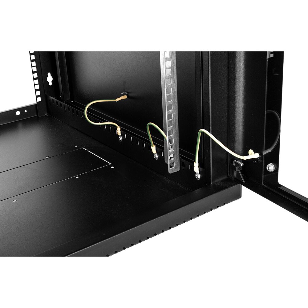 Настенный шкаф 19 ШРН устанавливается на стену через отверстия в задней стенке, доступ к оборудованию возможен с двух сторон. В крыше и основании ШРН предусмотрены места для установки вентиляторных модулей R-FAN и щёточных вводов КВ-Щ . Система заземления входит в стандартную комплектацию шкафа. Вертикальные направляющие регулируются по глубине. Задняя часть корпуса шкафа имеет юнитовую перфорацию, что позволяет производить монтаж оборудования и аксессуаров имеющих четыре точки крепления. Также возможна установка второй пары вертикальных направляющих. Возможна установка задней стенки. Настенный шкаф 19 ШРН поставляется в собранном виде.