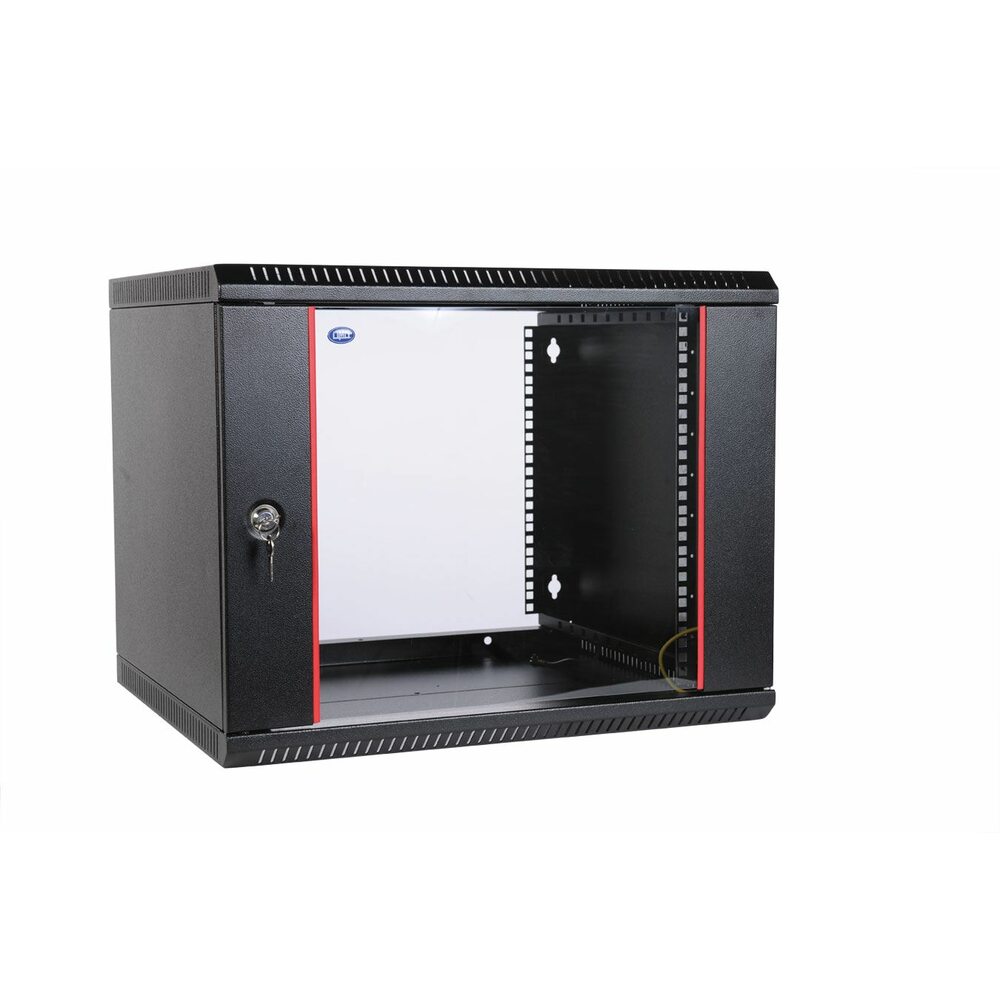 Настенный шкаф 19" ШРН-Э имеет полностью разборную конструкцию и состоит из пяти основных частей: крыша, дно, две передние направляющие, две боковые стенки c вертикальными направляющими, дверь. Настенный шкаф 19" ШРН-Э легок в сборке. За счет элементов крепления каркас шкафа имеет повышенную жесткость. Возможна комплектация металлической дверью и дверью с тонированным стеклом. Возможна установка двери как с правой, так и с левой стороны. Дверь фиксируется точечным замком. Предусмотрены два кабельных ввода в верхней и нижней частях шкафа, размер – 95х40мм. Перфорация обеспечивает хорошую вентиляцию установленного оборудования. В основание или крышу шкафа возможна установка вентиляторного модуля МВ-400-2. Для установки модуля демонтируется заглушка, и модуль фиксируется шестью винтами. Вертикальные направляющие регулируются по глубине. Система заземления входит в стандартную комплектацию. Возможна установка задней стенки.