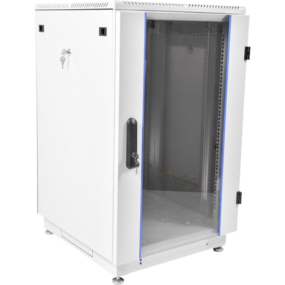 Шкаф имеет разборную каркасную конструкцию. Легок в сборке. Состоит из основания, крыши и двух сварных рам, соединенных комплектом швеллеров. На боковых элементах рамы выполнена дополнительная перфорацию под закладные гайки. Стандартно шкафы комплектуются задней металлической стенкой, и тремя видами дверей: цельнометаллической, с тонированным ударопрочным стеклом, и дверью с перфорацией. Возможна комплектация двумя дверьми, исключающая заднюю стенку. В шкафах 18-36U, дверь фиксируется усиленным точечным замком, 42-48U ригельным. Двери имеют как правую, так и левую навеску, угол открытия 180 градусов. Усиленная конструкция допускает распределенную статическую нагрузку до 1200 кг.