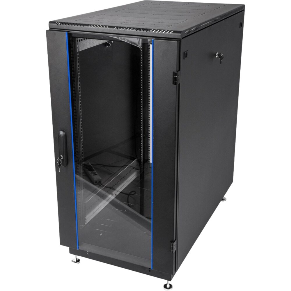 Шкаф имеет разборную каркасную конструкцию. Легок в сборке. Состоит из основания, крыши и двух сварных рам, соединенных комплектом швеллеров. На боковых элементах рамы выполнена дополнительная перфорацию под закладные гайки. Стандартно шкафы комплектуются задней металлической стенкой, и тремя видами дверей: цельнометаллической, с тонированным ударопрочным стеклом, и дверью с перфорацией. Возможна комплектация двумя дверьми, исключающая заднюю стенку. В шкафах 18-36U, дверь фиксируется усиленным точечным замком, 42-48U ригельным. Двери имеют как правую, так и левую навеску, угол открытия 180 градусов. Усиленная конструкция допускает распределенную статическую нагрузку до 1200 кг.