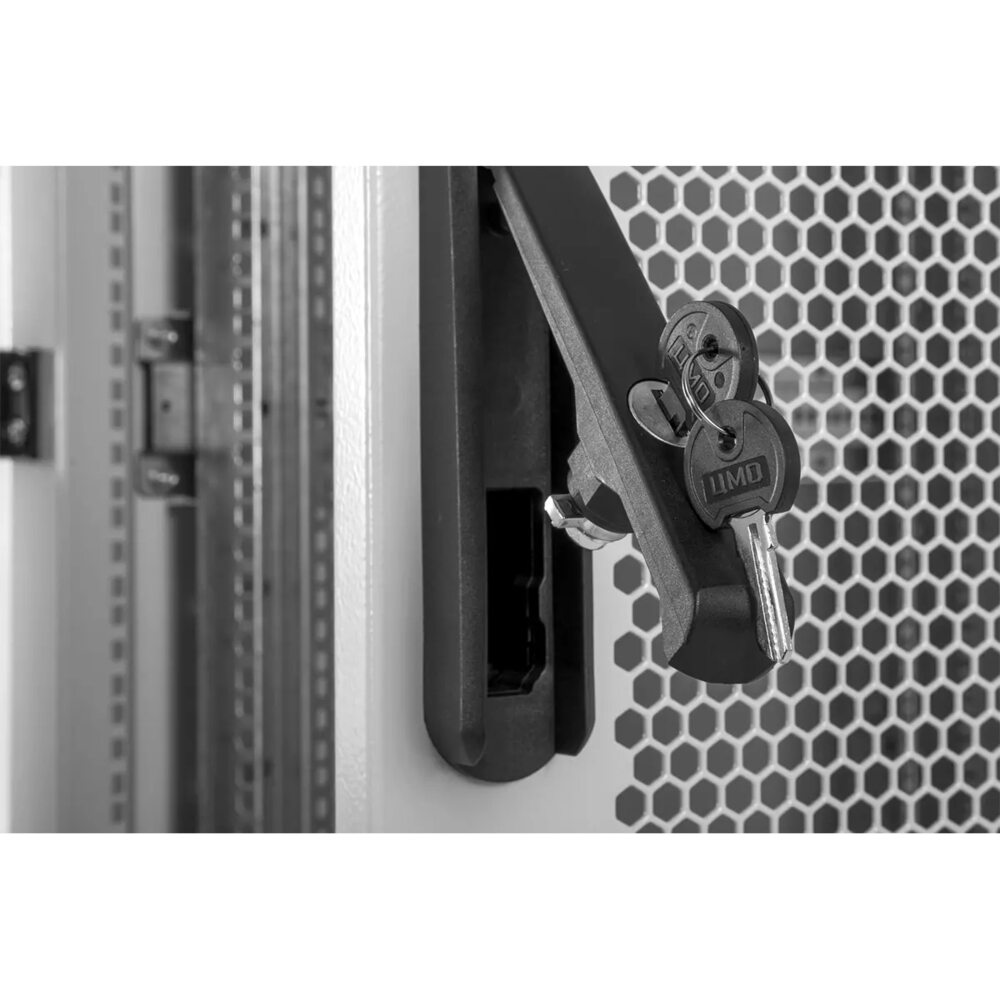 Шкаф имеет разборную каркасную конструкцию. Легок в сборке. Состоит из основания, крыши и двух сварных рам, соединенных комплектом швеллеров. На боковых элементах рамы выполнена дополнительная перфорацию под закладные гайки. Шкаф стандартно комплектуется одинарными или двойными перфорированными дверями с ригельными замками и боковыми стенками. Стенка шкафов глубиной 600 и 800 мм состоит из одного легкосъемного бокового элемента с точечными замками, а шкафов глубиной 1000 и 1200 мм из двух. Одинарные двери имеют как правую, так и левую навеску, угол открытия 180 градусов. Усиленная конструкция допускает распределенную статическую нагрузку до 1200 кг.