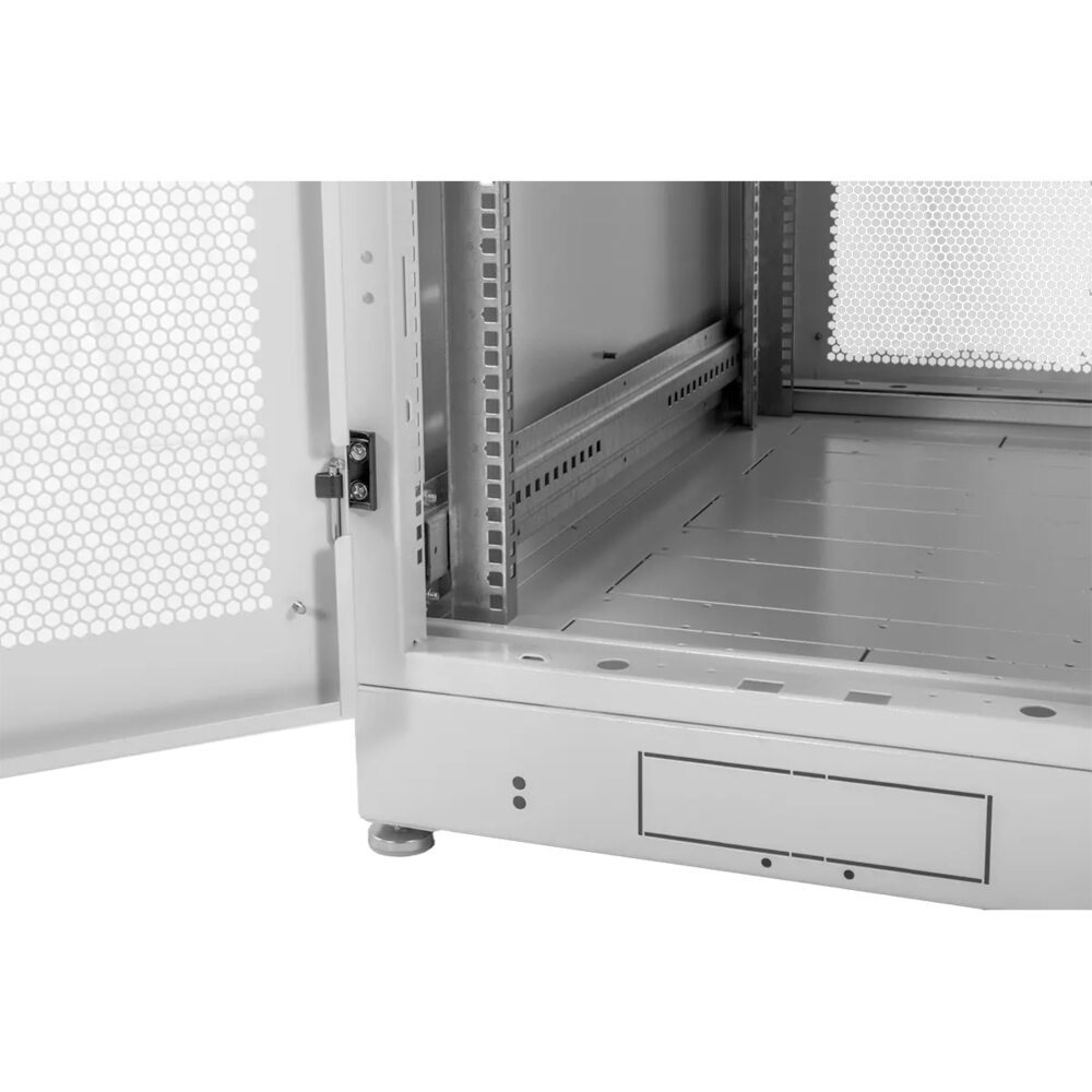 Шкаф имеет разборную каркасную конструкцию. Легок в сборке. Состоит из основания, крыши и двух сварных рам, соединенных комплектом швеллеров. На боковых элементах рамы выполнена дополнительная перфорацию под закладные гайки. Шкаф стандартно комплектуется одинарными или двойными перфорированными дверями с ригельными замками и боковыми стенками. Стенка шкафов глубиной 600 и 800 мм состоит из одного легкосъемного бокового элемента с точечными замками, а шкафов глубиной 1000 и 1200 мм из двух. Одинарные двери имеют как правую, так и левую навеску, угол открытия 180 градусов. Усиленная конструкция допускает распределенную статическую нагрузку до 1200 кг.