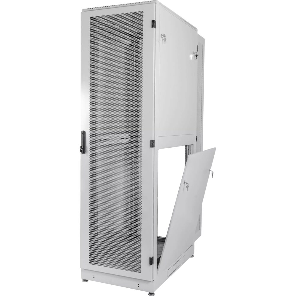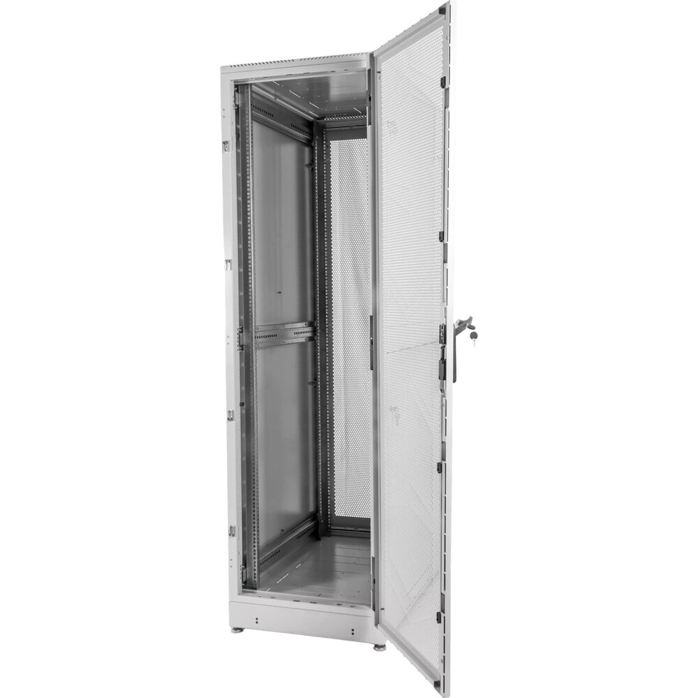 Шкаф имеет разборную каркасную конструкцию. Легок в сборке. Состоит из основания, крыши и двух сварных рам, соединенных комплектом швеллеров. На боковых элементах рамы выполнена дополнительная перфорацию под закладные гайки. Шкаф стандартно комплектуется одинарными или двойными перфорированными дверями с ригельными замками и боковыми стенками. Стенка шкафов глубиной 600 и 800 мм состоит из одного легкосъемного бокового элемента с точечными замками, а шкафов глубиной 1000 и 1200 мм из двух. Одинарные двери имеют как правую, так и левую навеску, угол открытия 180 градусов. Усиленная конструкция допускает распределенную статическую нагрузку до 1200 кг.