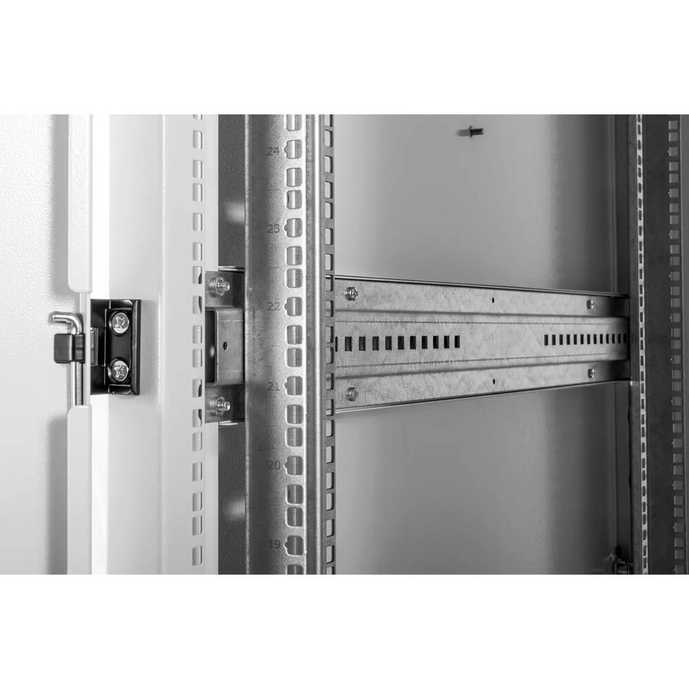 В базовой комплектации шкаф имеет четыре оцинкованные вертикальные направляющие, регулируемые по глубине. Предусмотрена система заземления (провода для заземления всех деталей шкафа входят в комплект поставки).