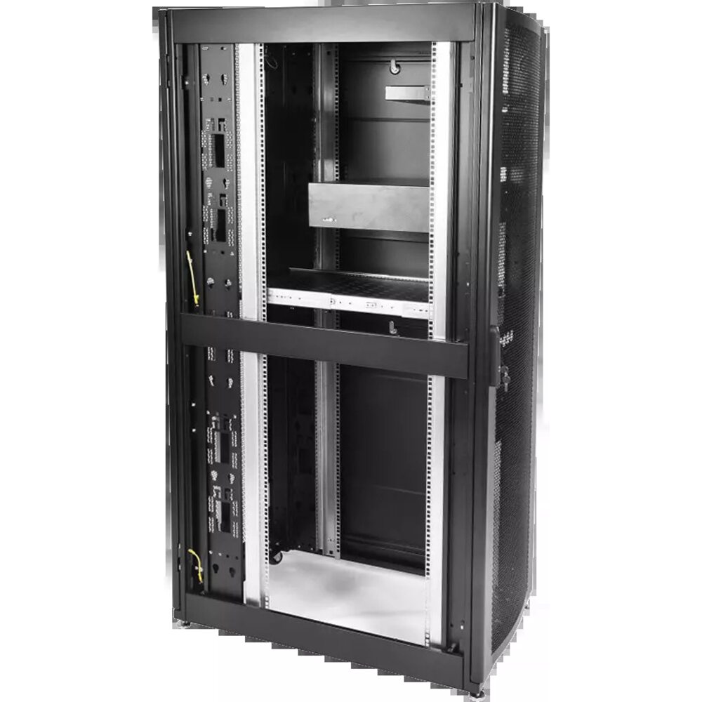 Нижняя часть полая, обеспечивающая хороший доступ к коммутациям в подготовленном помещении. В нижней части шкафа можно установить панели различного назначения (например, фальшпол ОС-ШТК-СП-х). Так же в нижней части шкафа установлены регулируемые опоры и транспортировочные ролики для перемещения шкафа без оборудования. Предусмотрено крепление основания шкафа к полу (кронштейны в базовой поставке крепят шкаф к деревянному поддону). Доступ для монтажа, коммутации и обслуживания оборудования возможен с четырех сторон: через боковые стенки, переднюю и заднюю двери. В базовой комплектации шкаф имеет 4 оцинкованные вертикальные направляющие, регулируемые по глубине. Предусмотрена система заземления (провода для заземления всех деталей шкафа входят в комплект поставки). Тыльная часть шкафа стандартно комплектуется вертикальными кабельными органайзерами шириной 116 мм, перфорированными для удобства размещения блоков розеточных (PDU), укладки и фиксации кабелей. В организаторах предусмотрена система отверстий для быстрой безинструментальной установки и снятия различных типов блоков и оборудования.