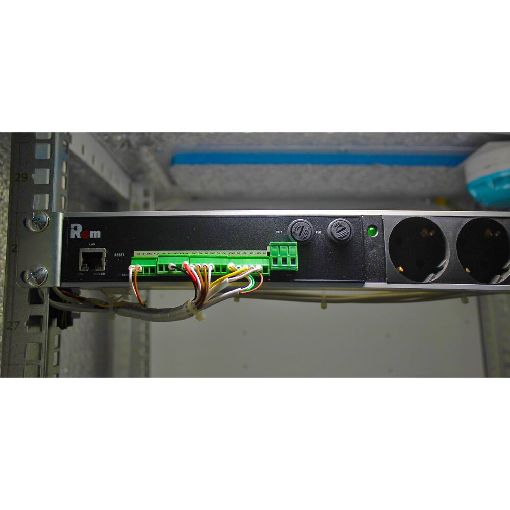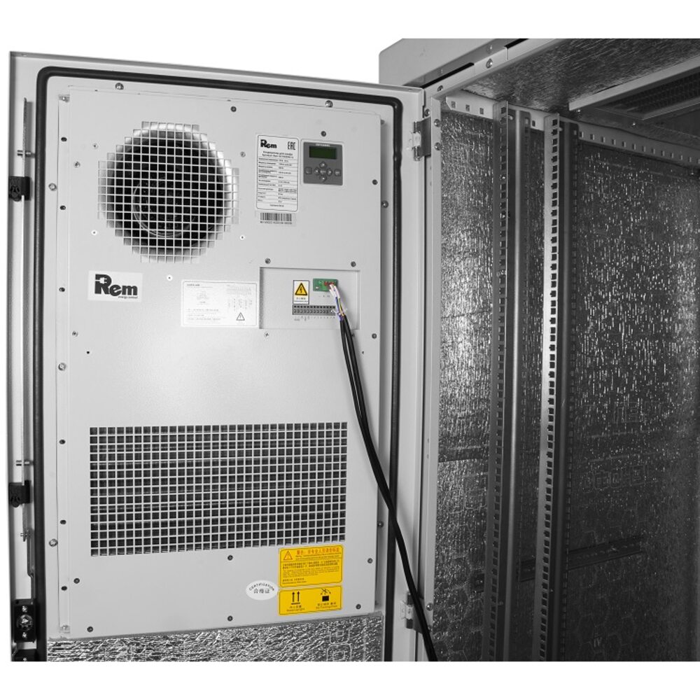Система мониторинга включает установленные в шкафу контроллер Rem-MC3 со встроенным датчиком удара, датчик открытия двери, цифровой датчик влажности и температуры RS-HT1, датчик дыма, датчик протечки. Система климат-контроля REM, установленная на передней двери шкафа, представляет собой кондиционер мощностью от 1000 до 2000 Вт, интегрированный с контроллером Rem-MC3 по интерфейсу RS-485, и нагревателем, имеющим мощность по теплу от 500 до 1000 Вт.