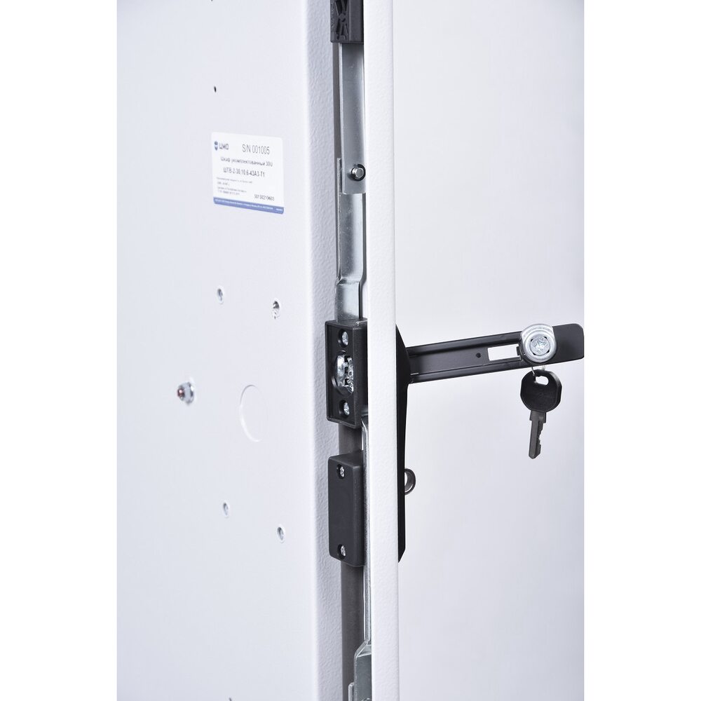 В основании шкафа предусмотрены отверстия для ввода кабелей. В комплект поставки входят два кабельных ввода с гайкой М32 (типа MG32A-25G), 10 резиновых заглушек для отверстий под ввод кабеля, а также набор для блокировки задней двери изнутри шкафа.