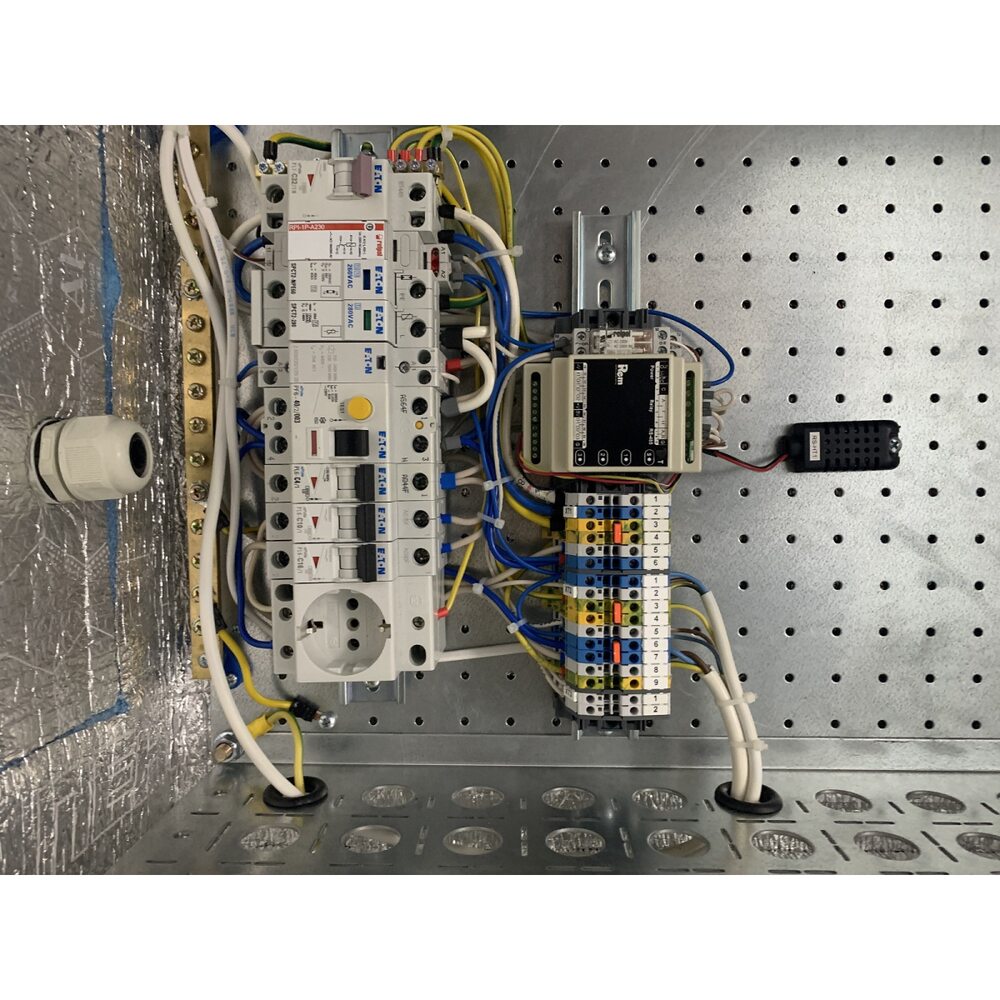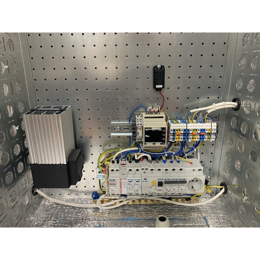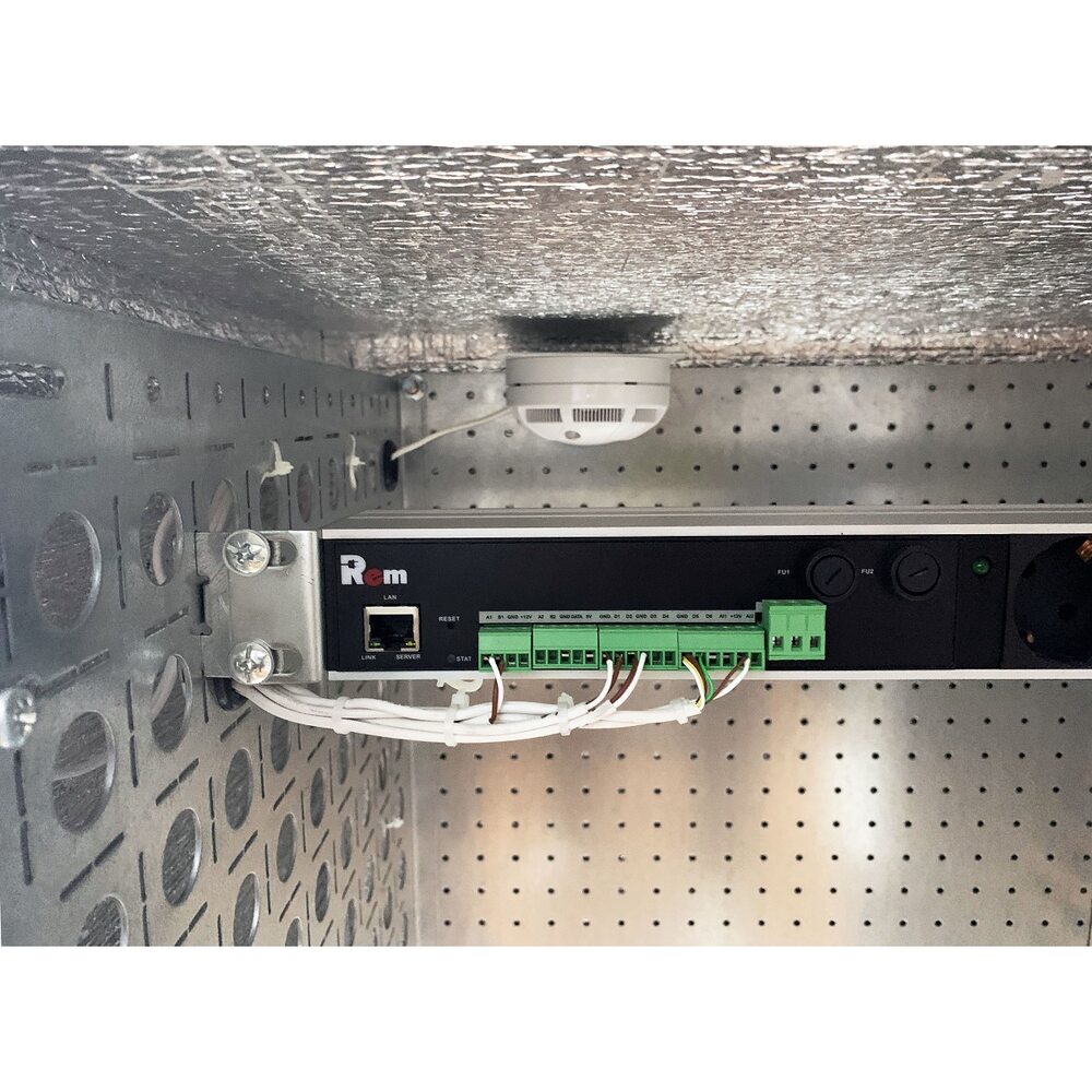 Система мониторинга включает установленные в шкафу контроллер Rem-MC1 со встроенным датчиком удара, датчик открытия двери, цифровой датчик влажности и температуры RS-HT1, датчик дыма, датчик протечки. Цифровой модуль Rem-MC-DMTH поддерживает заданную температуру и влажность в установленных параметрах круглый год, а также для обеспечения работы подключаемого активного оборудования в заданном диапазоне температуры и влажности предусматриваются функции холодного и горячего старта, по предельным значениям температуры и влажного старта по предельному значению влажности.