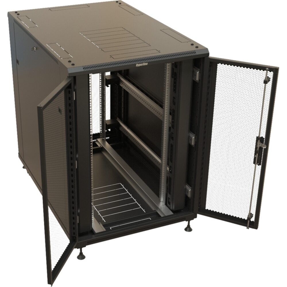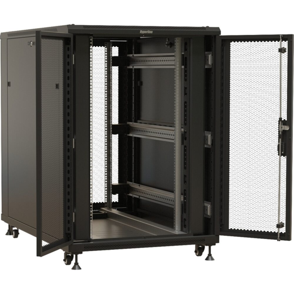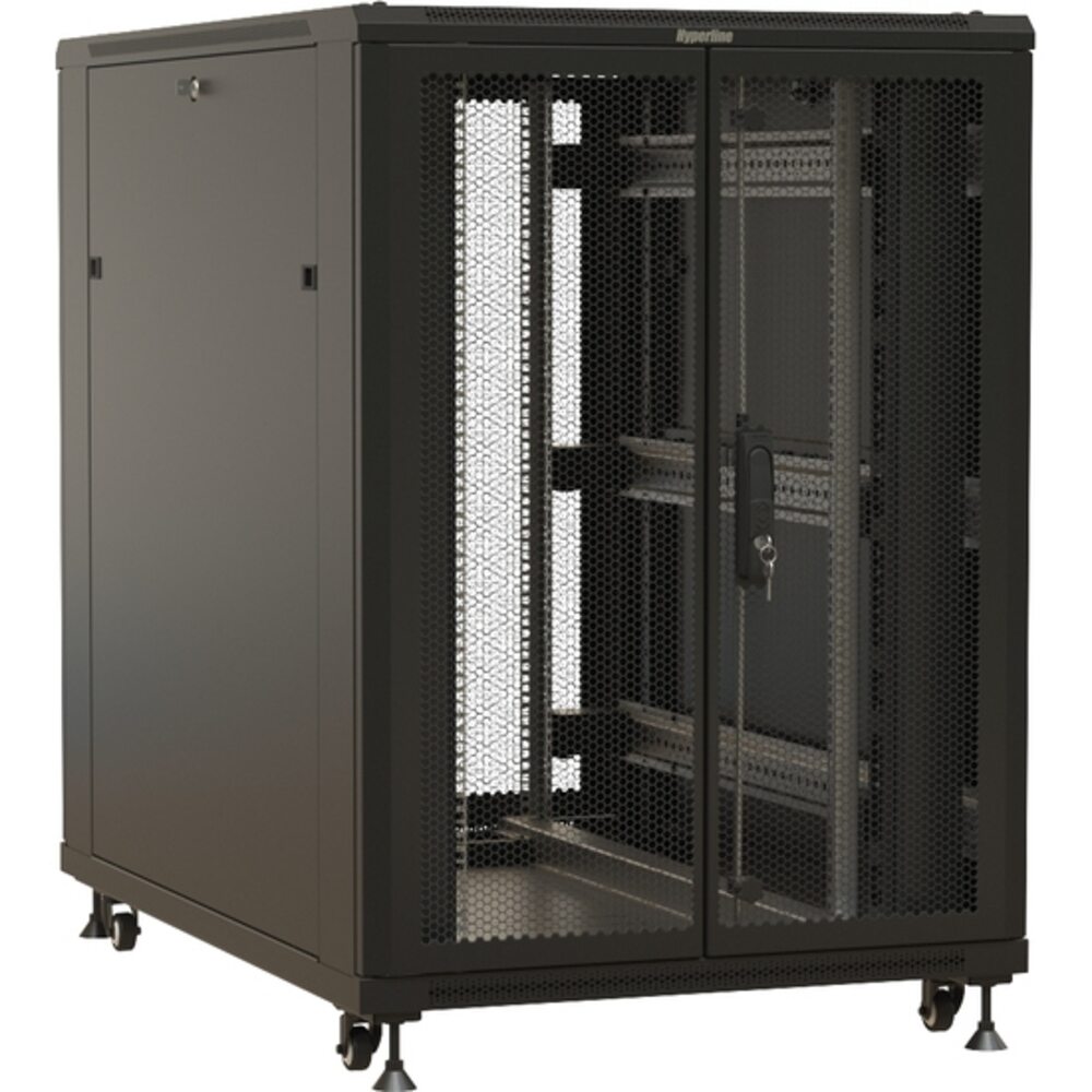 Hyperline TTBR-2288-DD-RAL9004 Шкаф напольный 19-дюймовый, 22U, 1166x800х800 мм (ВхШхГ), передняя и задняя распашные перфорированные двери (75%), ручка с замком, 2 вертикальных кабельных организатора, цвет черный (RAL 9004) (разобранный).