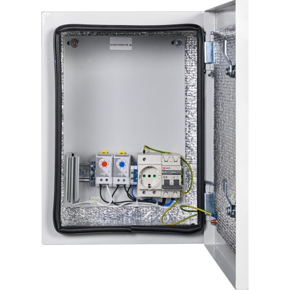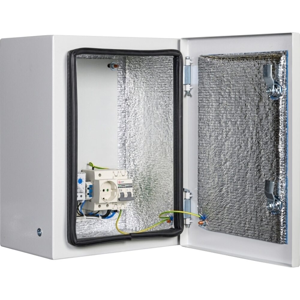 Комплектация: утеплитель из порилекса, замок 2 шт, ключ 1 шт, монтажная плата 1шт, гермовводы 2 шт (MG-25), розетка 1 шт, автоматический выключатель, 6А 1шт, клемма для подключения оборудования 2 шт, клемма заземления 1 шт, термореле 1шт, реле предстарта 1 шт, нагреватель мощностью 50 Вт 1шт.