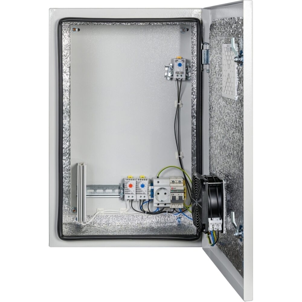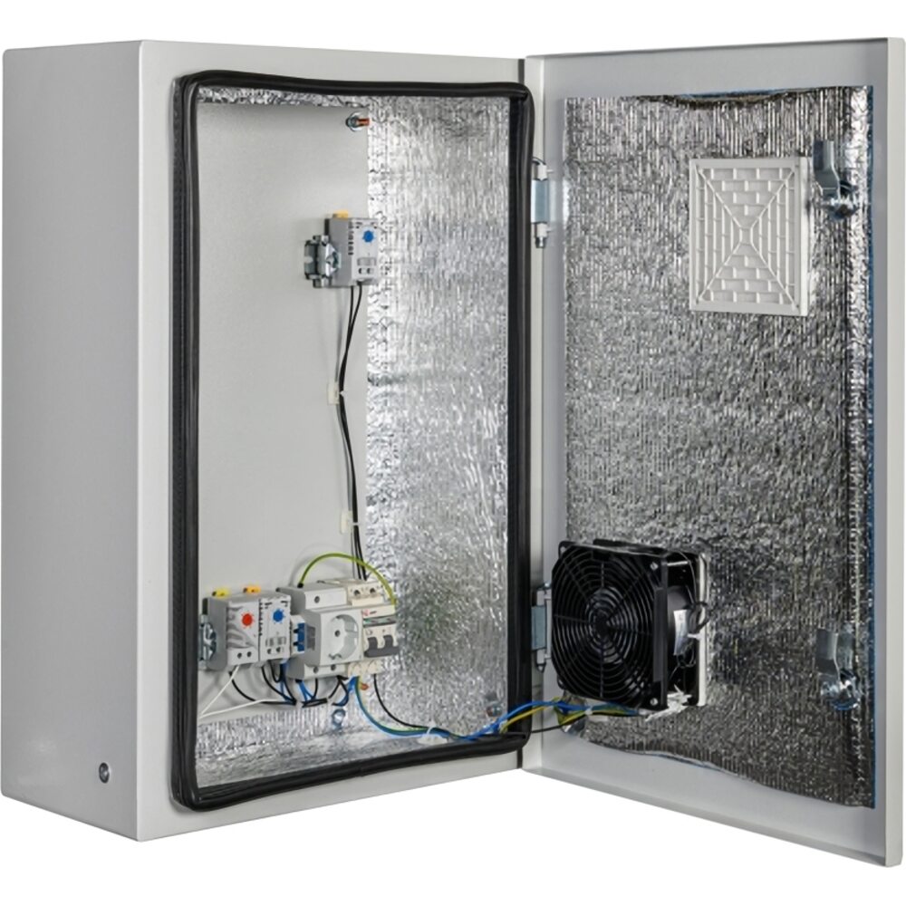 Шкаф представляет собой цельнометаллическую сварную конструкцию, состоящую из корпуса и двери, изготовленных из стали и покрытых порошковой полиэфирной краской цвет RAL 7035. Утепление шкафа выполнено из изолона фольгированного толщиной 10мм. Внутри корпуса установлена монтажная панель со смонтированными компонентами системы поддержания температуры, обеспечивающей безопасную работу размещенного в нём оборудования при температуре окружающего воздуха от -55С до +50С. Шкаф оснащён термостатом предстарта оборудования, обеспечивающим включение, размещённого в шкафу, электрооборудования только при условии достижения оптимальной температуры эксплуатации этого оборудования.