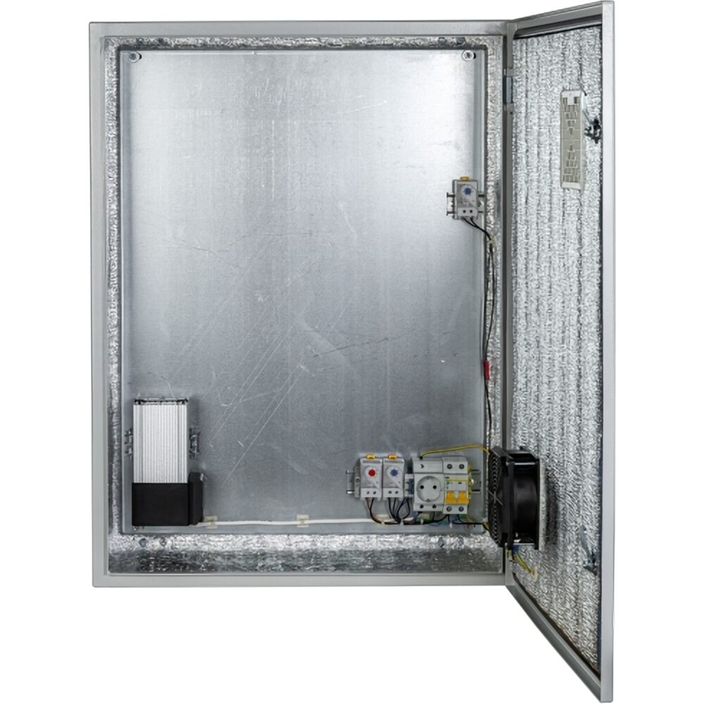 Комплектация: утеплитель из перилекса НПЭ, замок 2 шт, ключ 1 шт, монтажная плата 1шт, гермовводы 5 шт., розетка 1 шт, автоматический выключатель 1шт, термореле 1 шт, реле предстарта 1 шт, нагреватель мощностью в 250 Вт 1шт, вентилятор NTL FF 152 1шт, вентиляционные панели 2шт.