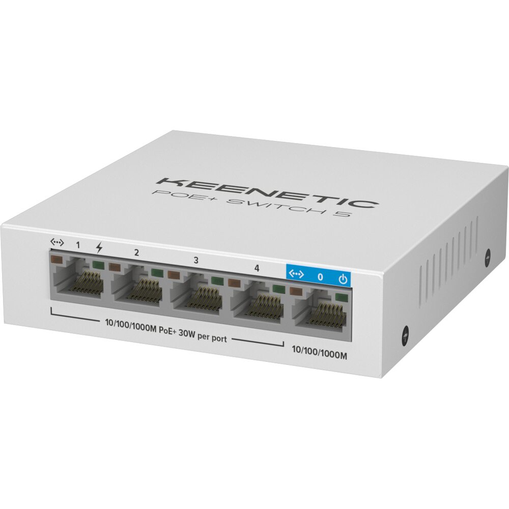 Keenetic PoE+ Switch 5 - 5-портовый гигабитный коммутатор с 4 портами PoE+ и бюджетом мощности 60 Вт.