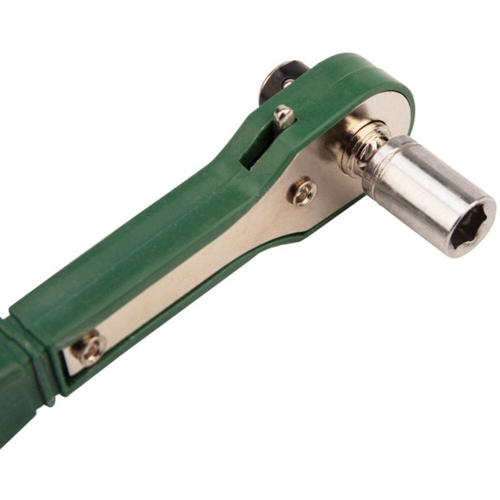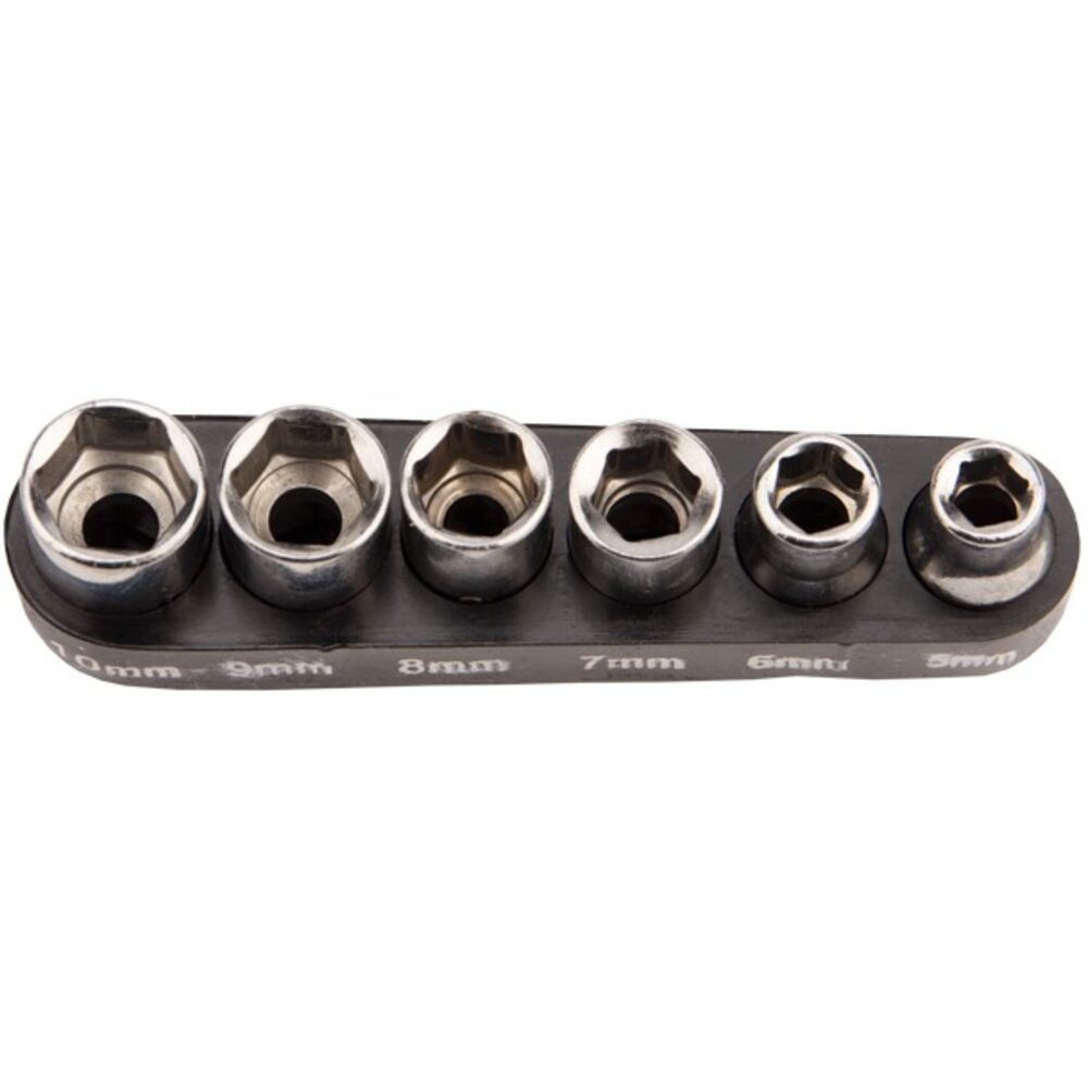 В наборе 6 съемных торцевых головок: 5,6,7,8,9,10 мм, которые имеют 6-гранный зев и посадочное место для присоединительного квадрата 1/4. Твердость материала рабочей части головок: 55-58 HRС.