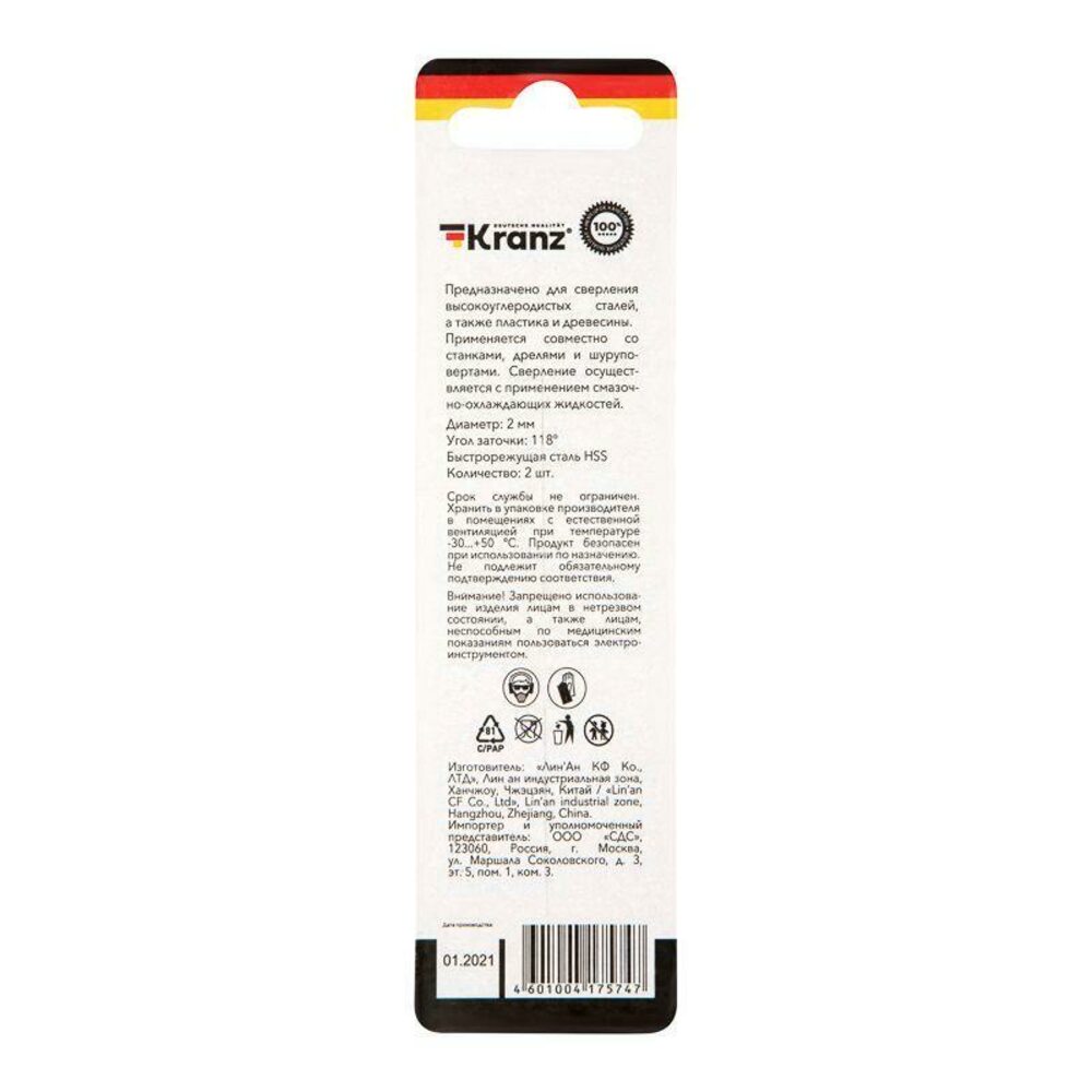 Сверло по металлу 2мм HSS DIN 338 (уп.2шт) Kranz KR-91-0553
