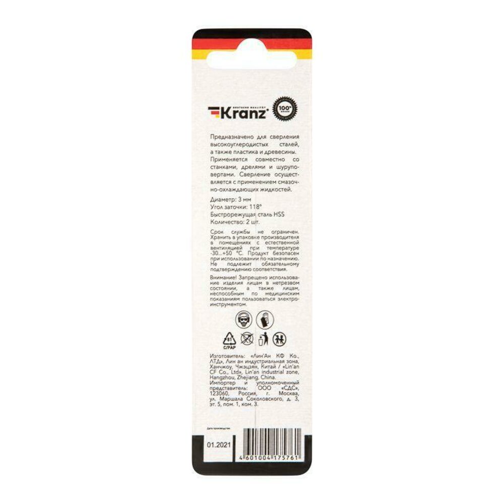Сверло по металлу 3.0мм HSS DIN 338 (уп.2шт) Kranz KR-91-0556