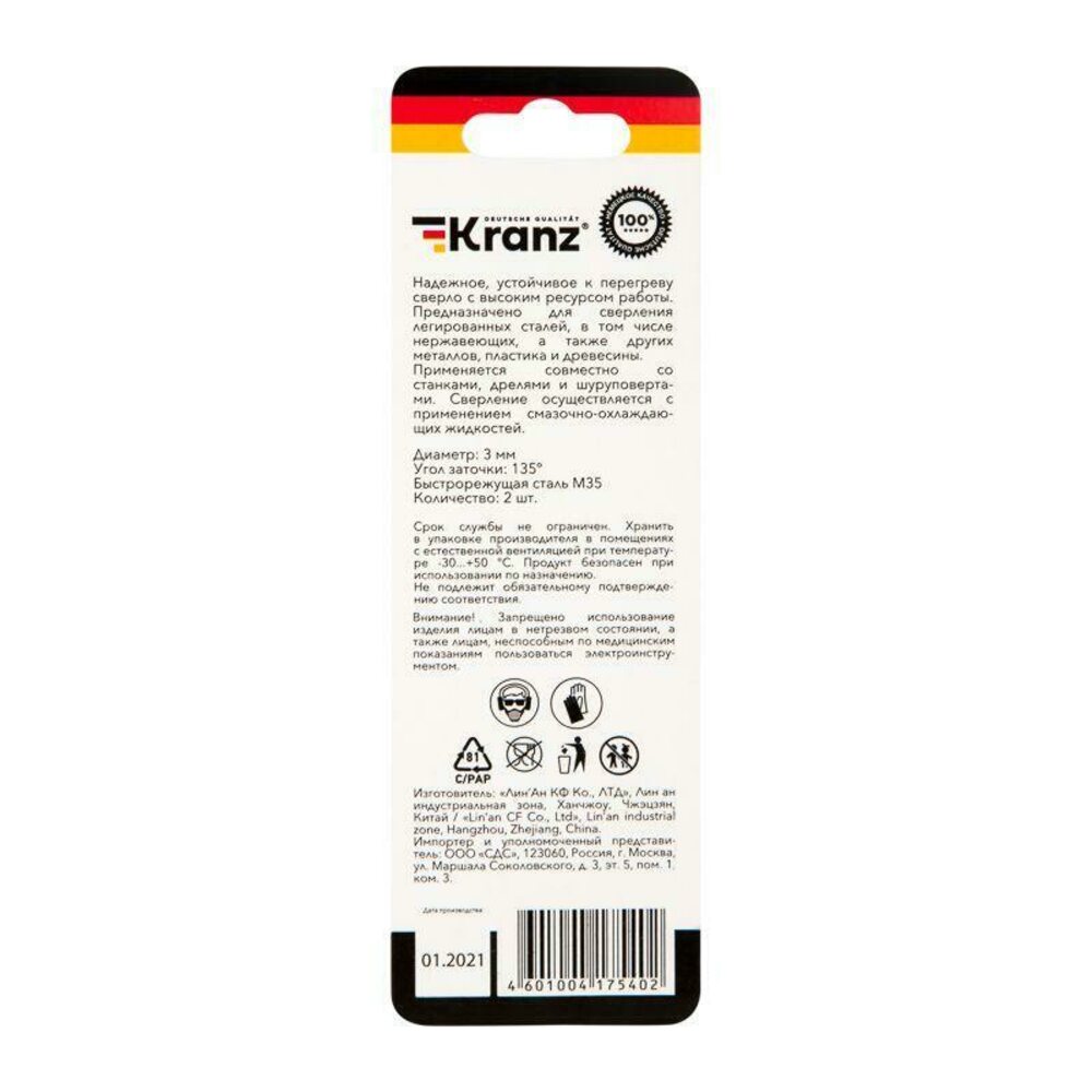 Сверло по металлу 3мм 'Кобальт' (сталь HSS-Co 5% M35 P6M5K5) DIN 338 (блист.2шт) Kranz KR-91-0502