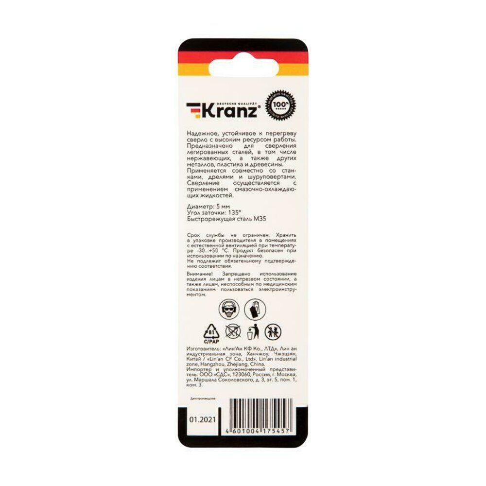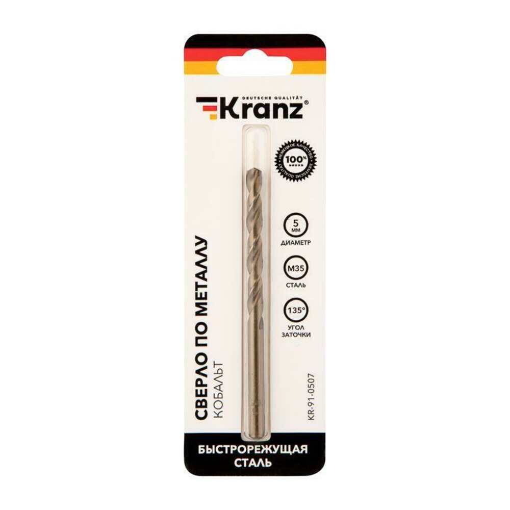 Сверло по металлу 5мм 'Кобальт' (сталь HSS-Co 5% M35 P6M5K5) DIN 338 (блист.1шт) Kranz KR-91-0507