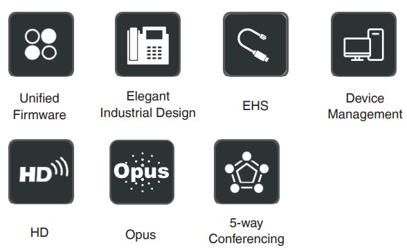 - Hot-desking, экстренный вызов, интерком, paging, music on hold, напоминание