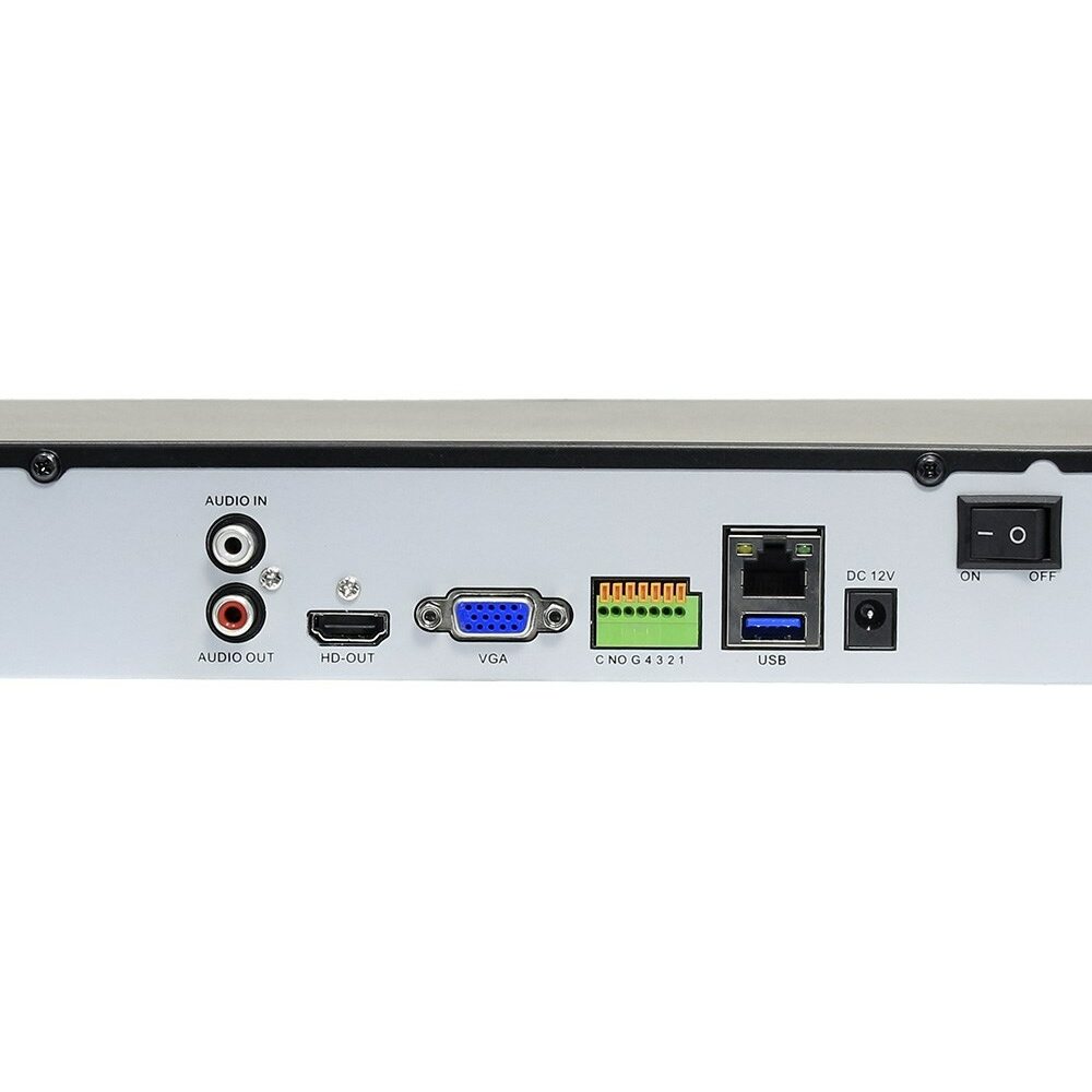 Видеорегистратор имеет 4 входа / 1 выход (24В/1А) тревоги. 1 малошумящий вентилятор охлаждения. Питание регистратора 12В/4А от внешнего компактного адаптера (в комплекте) с входным напряжением ~110-240В. В комплекте с регистратором поставляется: мышь, адаптер питания и паспорт. Габаритные размеры, 380(ш) × 316(г) × 51(в) мм, вес 1,7 кг (без HDD).