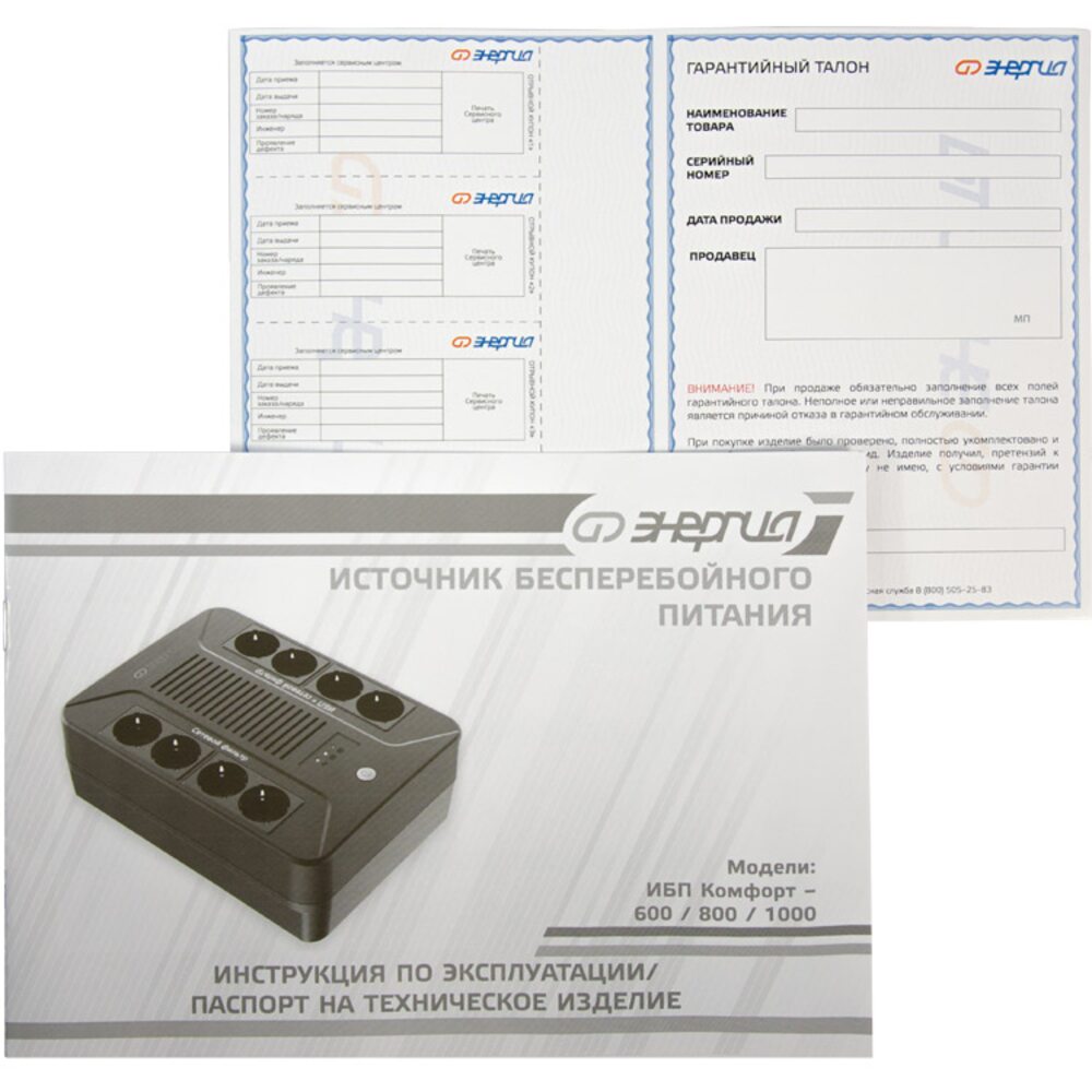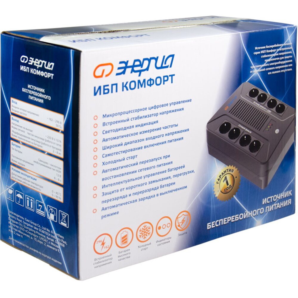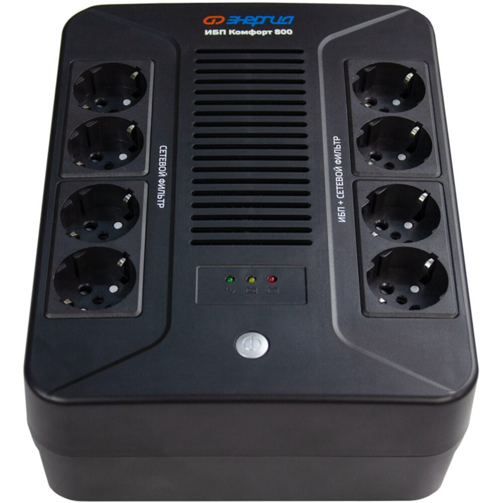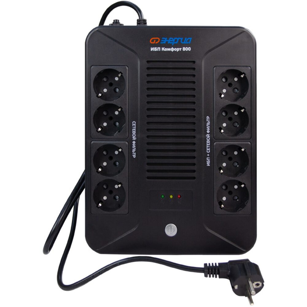 ИБП Энергия Комфорт 800. Источники бесперебойного питания серии Энергия ИБП Комфорт предназначены для защиты персональных компьютеров, аудиовидеоаппаратуры, офисной техники и другого оборудования небольшой мощности. Прибор прост в эксплуатации и оснащен восемью розетками, четыре из которых работают в режиме источника бесперебойного питания, стабилизатора и сетевого фильтра, и четыре в режиме сетевого фильтра. Способы установки напольный. *Заявленная точность выходного стабилизированного напряжения 10% обеспечивается в диапазоне входных напряжений 170-280 В.