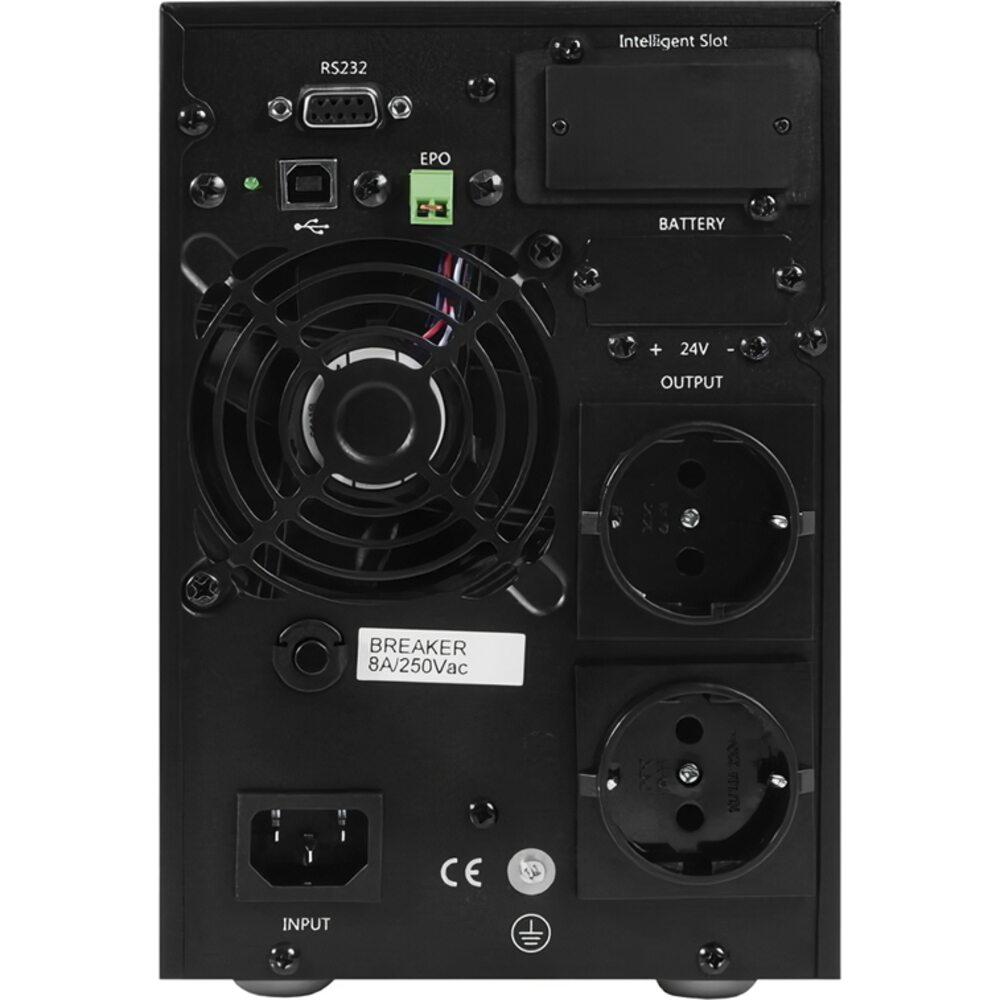 Построен по схеме двойного преобразования энергии, которая не требует переключения питания сеть/батарея. Форма выходного напряжения - ВСЕГДА синусоидальная.