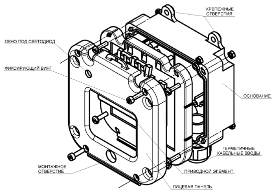 Конструктивно устройство состоит из пластикового корпуса, основание которого с электронным блоком закрепляются на стене помещения. Затем лицевая панель с приводным элементом шурупами крепится к основанию. Корпус устройства по требованию заказчика может быть оборудован герметичными пластиковыми кабельными вводами для подведения проводников диаметром от 6 до 14 мм или от 11 до 17 мм, герметичными вводами МКВ из нержавеющей стали марки 12Х18Н10Т, предназначенными для различных вариантов прокладки кабеля количеством 2 шт.