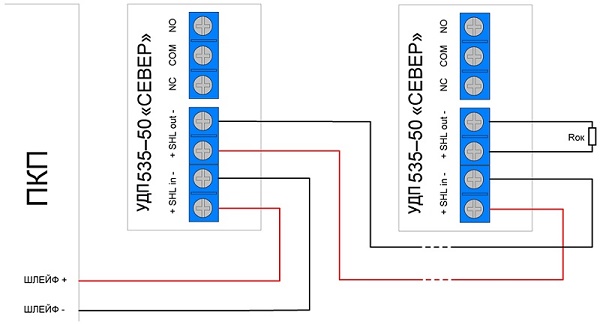 Устройство УДП 535–50 «СЕВЕР» может включаться в шлейф ПКП одновременно с другими двухпроводными извещателями.