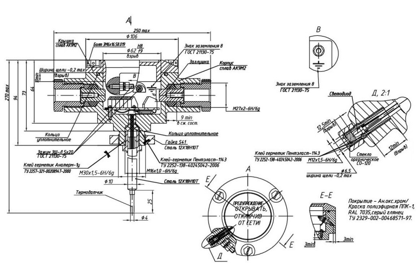 Габаритный чертеж извещателей ИП101-1В-R3-А в алюминиевом корпусе, совмещенный с чертежом взрывозащиты..
