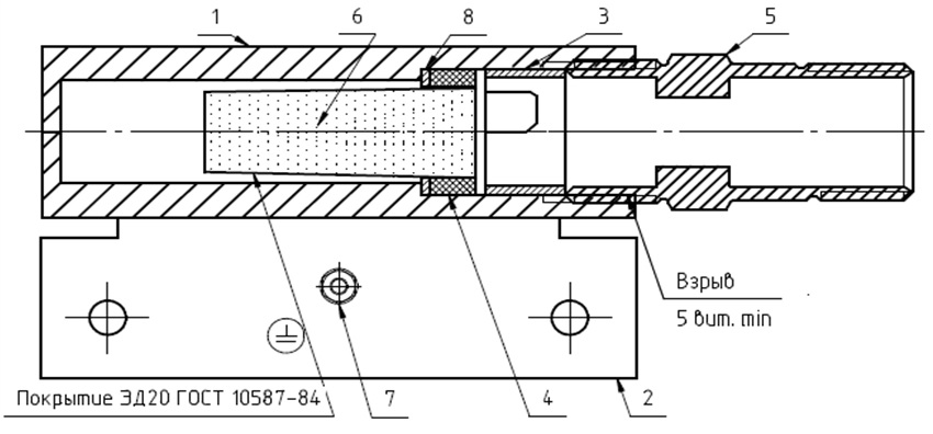 1 - Корпус датчика, 2 - Площадка приварная, 3 - Прижимное кольцо, 4 - Кольцо уплотнительное, 5 - Корпус ввода, 6 - Элемент чувствительный, 7 - Внешний зажим для заземления, 8 - Шайба