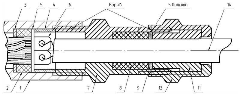 1 - Корпус датчика, 2 - Кольцо уплотнительное, 3 - Шайба, 4 - Прижимное кольцо, 5 - Плата датчика, 6 - Клемменый зажим, 7 - Корпус ввода, 8 - Уплотнитель кабеля, 9 - Шайба, 11 - Нажимная втулка, 13 - Гайка, 14 - Кабель
