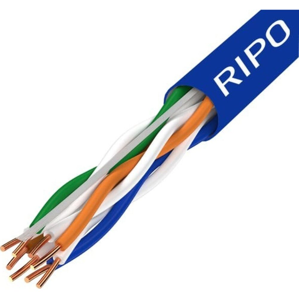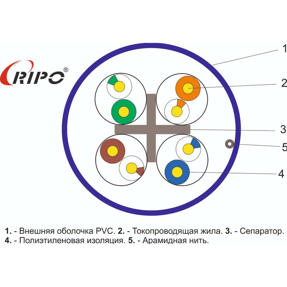 UTP 4 CAT6 23AWG Cu Ripo Plus – кабель типа витая пара, неэкранированный, 4-парный, выполненный из медной проволоки, категории 6. Каждая жила изолирована слоем диэлектрика – полиэтиленом высокой плотности с цветовым различием.