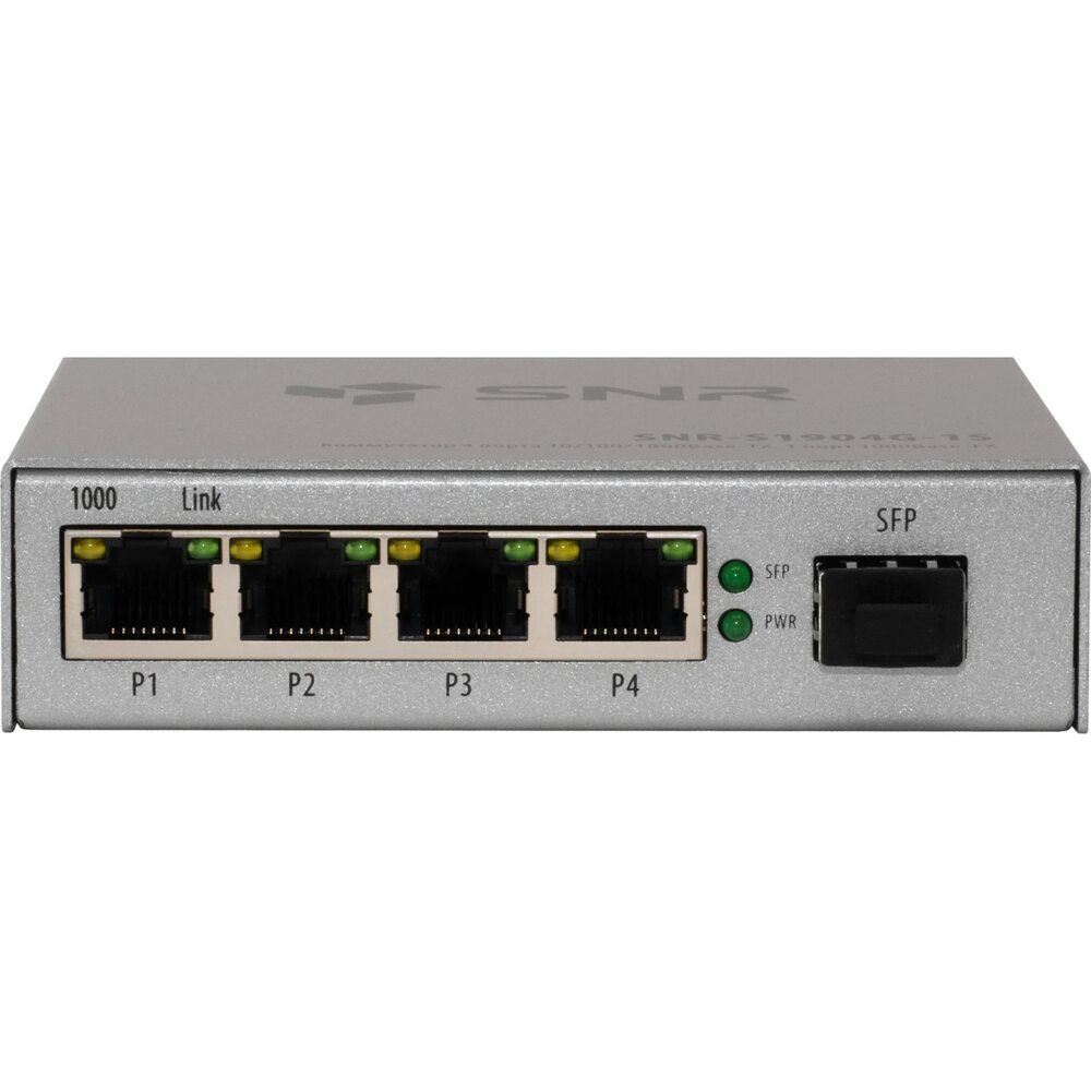 SNR-S1904G-1Sимеет 4 порта GigabitEthernet 10/100/1000 Мбит/с для подключения абонентских линий и 1 порт 1000Base-X (SFP) для подключения к волоконно-оптической сети.