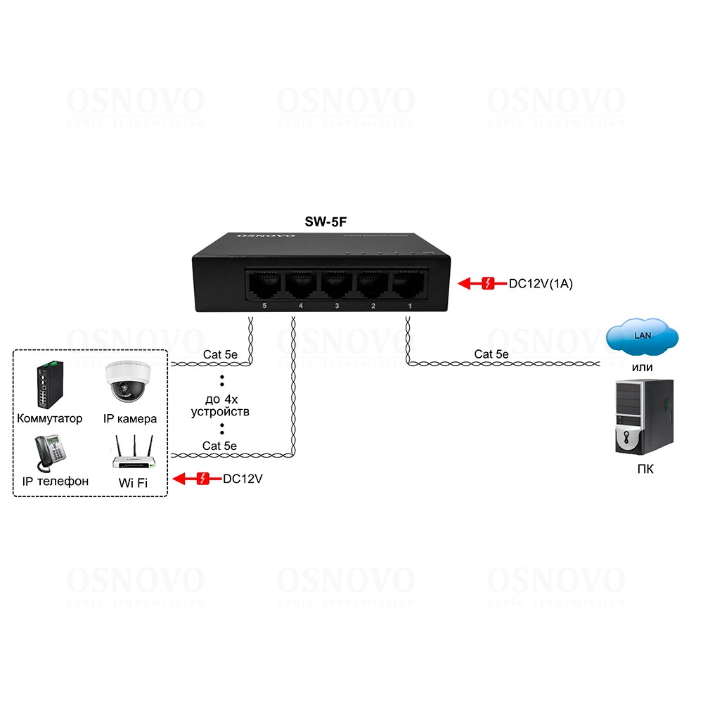 Коммутаторы SW-5F могут быть применены для решения самых различных задач, где требуется объединить различные сетевые устройства (IP-камеры, IP-телефоны, точки доступа и т.п.) в одну сеть.