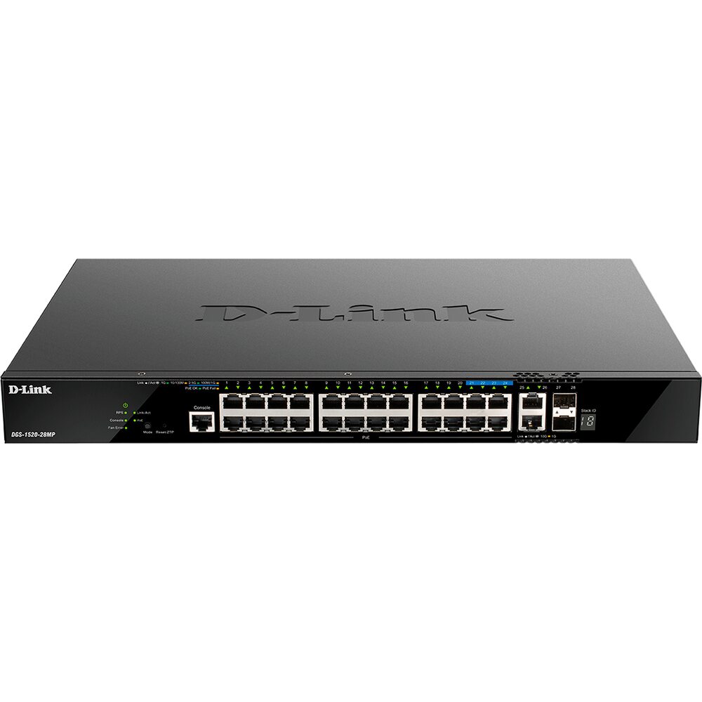 DGS-1520-28MPПоставляется в проекты - управляемый L3 стекируемый коммутатор с 20 портами 10/100/1000Base-T, 4 портами 100/1000/2.5GBase-T, 2 портами 10GBase-T и 2 портами 10GBase-X SFP+ (24 порта PoE 802.3af/at, PoE-бюджет 370 Вт, 740 Вт с DPS-700).