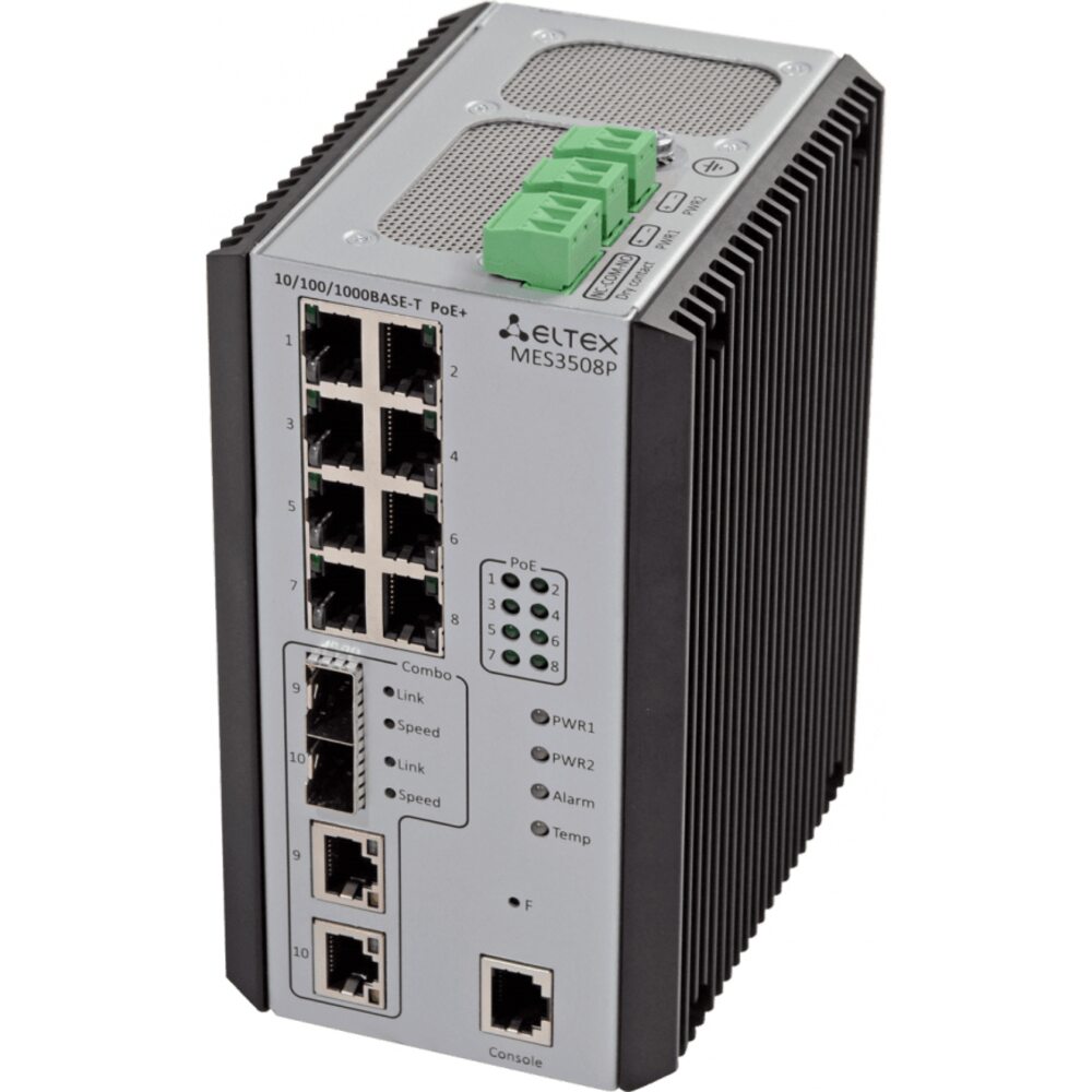 Промышленный коммутатор ELTEX MES3508P предназначен для организации защищенных отказоустойчивых сетей передачи данных на объектах, где необходимо выполнение требований по обеспечению устойчивости к воздействиям различного вида: температурным, механическим, вибрации и др. Оборудование оснащено гигабитными портами 10/100/1000