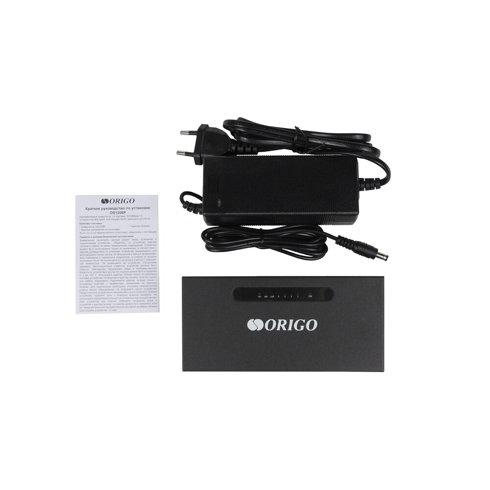 | Комплект поставки | • Коммутатор OS1206P/60W • Адаптер питания • Краткое руководство по установке |