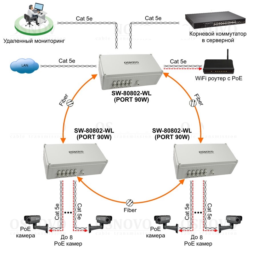 К каждому из 8 основных портов уличного коммутатора можно подключать РоЕ-устройства мощностью до 90 Вт. Общая выходная мощность (PoE бюджет) составляет 240Вт.