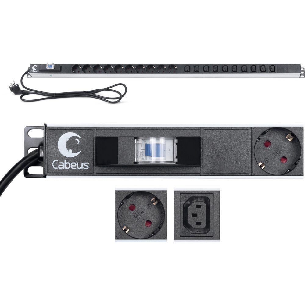 Cabeus PDU-16-10S-10C13-B Блок розеток для 19 шкафов, вертикальный, 10 розеток Schuko, 10 розеток IEC 320 C13, 16А, автомат защиты, алюминиевый корпус, шнур с вилкой Schuko 2 м